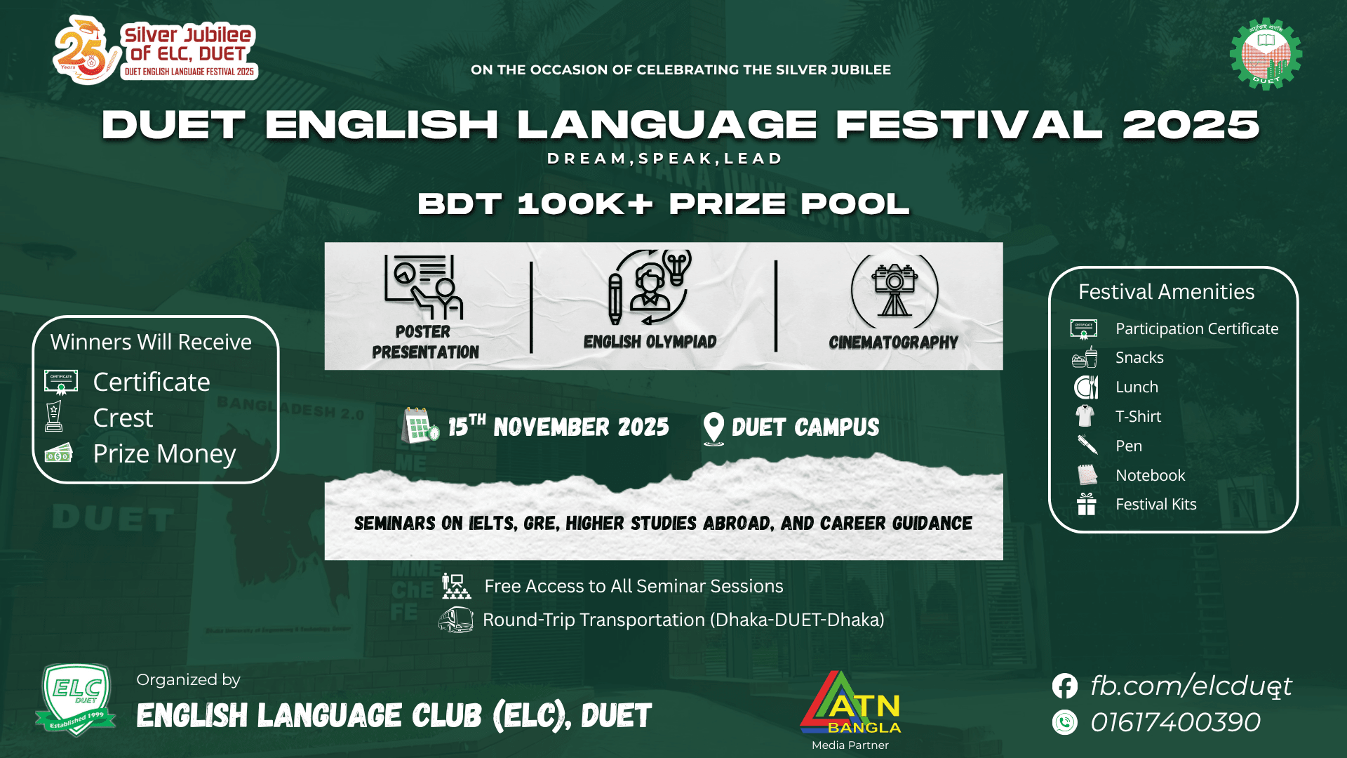 (Registration is Open! ) A short film contest (team of 2–3) encouraging young creators to showcase the power of English in education, innovation, and progress through 3–5 minute films. A Prize Pool of BDT 28,000. Amenities include Snacks, Lunch, T-shirt, Pen, Notebook, Festival Kit, and Access to all Seminar Sessions.